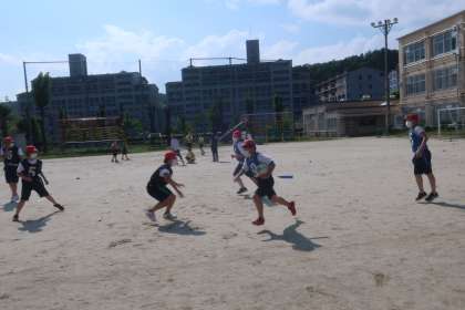 体育科「タグラグビー」の学習です。チーム内で作戦を立てて,試合にのぞんでいます。