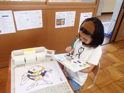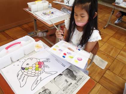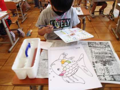 図工の学習で,初めて絵の具を使いました。今日は,絵の具の使い方を教わりながら,「にじいろの魚」のうろこを,丁寧に塗りました。みんなで「緑色」を作っても,それぞれちがった「緑色」になるのが,楽しかったです。