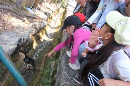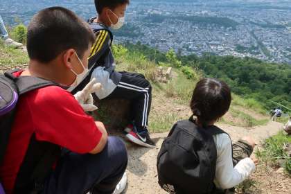 待ちに待った遠足。大文字山登山です。いままで歩いたことのない長時間の歩行。登山途中には,切り立った岩山や崩れた木々があちこちに・・・でも,心地よい鳥たちのさえずりや流れる小川のせせらぎとともに,自然界の生き物たちのパワーを全身に感じながら,みんなで声を掛け合って登頂することができました。