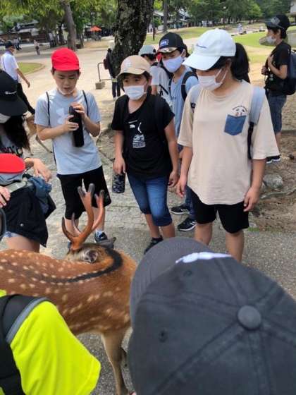 奈良公園で,鹿と触れ合いました。間近に見る鹿に大興奮でした。