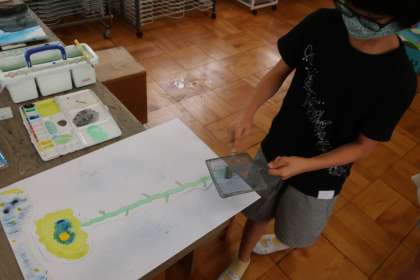いろいろな技法を使って,オリジナルの花をさかせた図画工作科『まぼろしの花』。