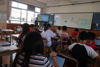 英語科の学習です。これまで習った様々な単語を交えながら,一生懸命誕生日を聞き出す子どもたち。相手が欲しいと思ったものの絵を描いて,GIGA端末を活用しながら素敵なカードに仕上げていました。