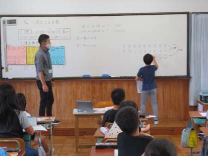 「一億をこえる数」の学習で「一億を10倍した数,100倍した数」や「一億を10でわった数,100でわった数」考え,「10倍」「100倍」「10でわる」「100でわる」ということについて決まりを見つけ出しました。