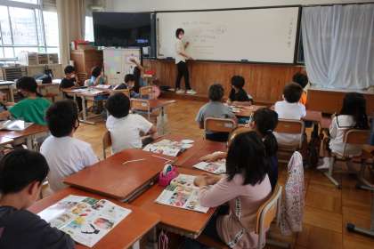 図画工作科の学習です。2種類のストローの組み合わせを考えながら,おもしろい動きをする作品についてアイディアを出し合いました。