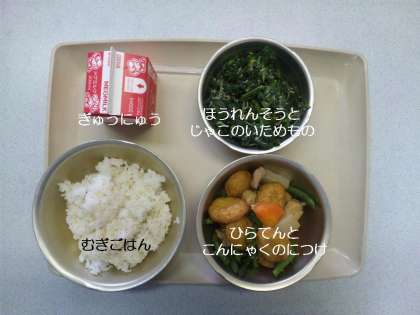 今日の給食のメニューは,平天とコンニャクの煮付け・ほうれん草とジャコの炒め物・麦ごはん・牛乳でした。