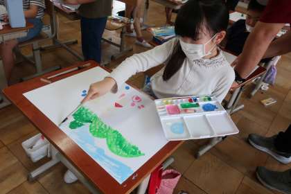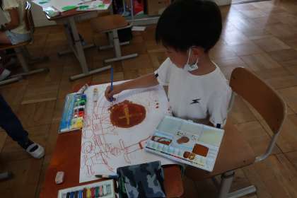図画工作科の学習です。先日登った「大文字山」の思い出を描きました。