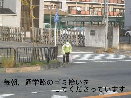 子ども見まもり隊の方は,子どもたちの安心・安全な登校を見まもっていただいているだけではありません。あちこちで通学路のゴミ拾いを子どもたちの登校前にしていただいています。おかげで通学路はいつもきれいです。ありがとうございます。