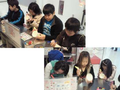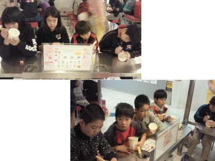 子どもたちは真剣な表情で,自分だけのカップヌードルを作っています。