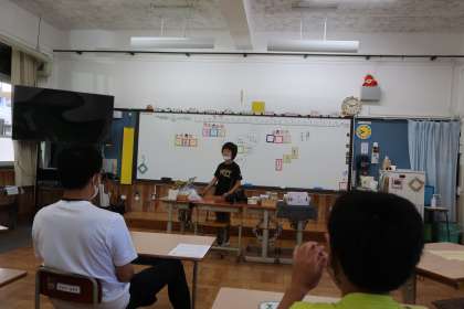 習った漢字や,自分たちの好きな漢字を使って,物語をつくりました。子どもたちは,自分が獲得した言葉や漢字から連想するものを,イメージを膨らませながらすばやく物語をつくっていきます。物語は奇想天外でドキドキわくわくな内容ばかり・・・でも最後はハッピーエンド(?)でした。