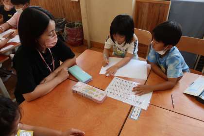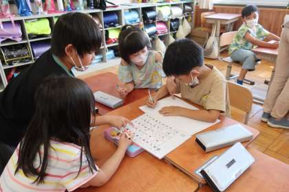 国語科の学習です。これまで学習したほとんどのひらがなを覚えた子どもたち。今日は、グループでしりとりをしました。イラスト入りの五十音表をヒントに、配られたワークシートに文字を書き込んで,楽しくしりとりをつなげていました。
