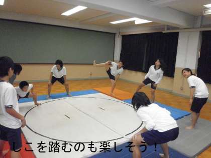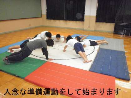 今日は,多目的室にマットと移動させての練習です。怪我をしないように十分な準備運動で体を温めます。そして,しこふみをしてはじまります。