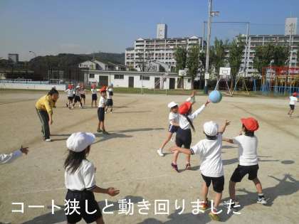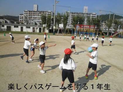 体育の時間に「パスゲーム」をしています。4年生のポートボールのようなゲームです。
