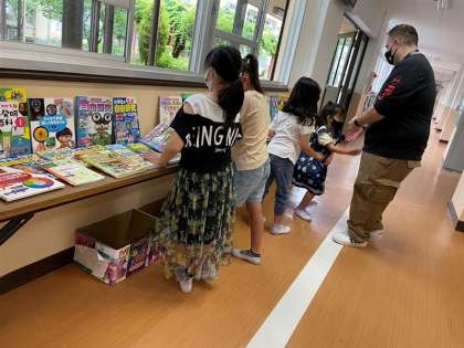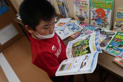 夏休みの自由研究に向け,職員室前に参考になる図書資料を陳列しました。並べるや否や,たくさんの子どもたちが本の前に集まっていました。