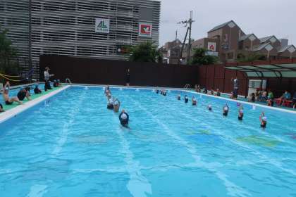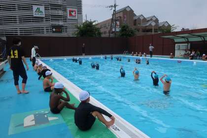 1年生と合同の学習です。今年初めてプールに入ってから2週間あまり。今ではほとんどの子どもたちが水に慣れ、プールの楽しさを味わうことができるようになりました。