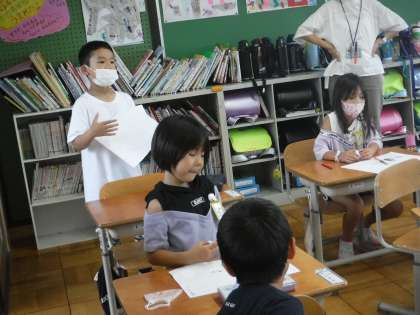 「おおきなかぶ」が抜けた後、おじいさん、おばあさん、まご、いぬ、ねこ、ねずみたちはどんなことを考えたのだろう?「おいしそう」「つかれた」など、それぞれの気持ちを考えて発表していました。