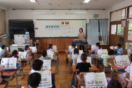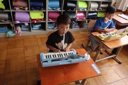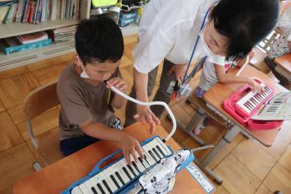 鍵盤ハーモニカで、合図に合わせて音を出しています。リズムにのって上手に音が出ていました。