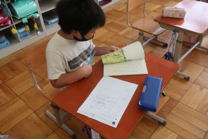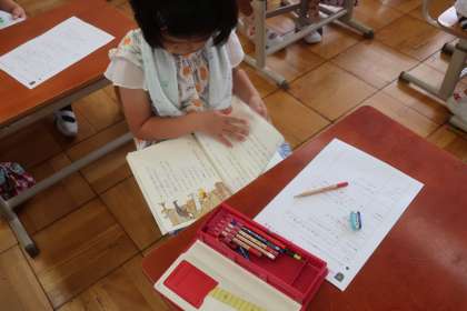 国語科の学習です。「ミリーのすてきなぼうし」の紹介文を考えています。登場人物を確認した後、どのようなお話だったか、ワークシートを活用しながら学習を進めていました。