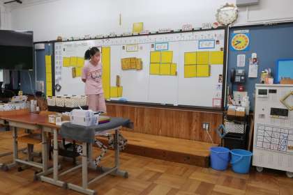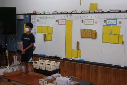 算数科「数と計算」の学習です。提示された数字をつみきで表したり、つみきで表された数を数字で表したりして、数概念を育んでいます。
