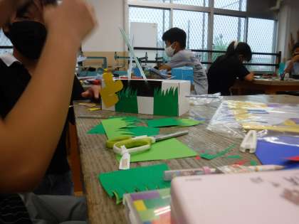 クランクの仕組みを生かして、表現したいことを考えたり、試したりしながら制作していました。