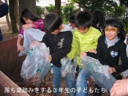 クリーンキャンペーンの時間を利用して,校区の公園にたまっている落ち葉を集め,堆肥箱に入れました。さっそく落ち葉踏みも行い,これから昨年に続いて堆肥作りをはじめます。がんばれ3年生!
