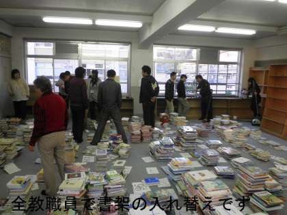 子どもたちが分類してくれた本が山と積んである中で,放課後,全教職員で書架の入れ替え作業をしました。大変な作業でしたが,予定通り無事終了しました。明後日に,4年生の子どもたちが,新しい書架に本を入れていってくれます。