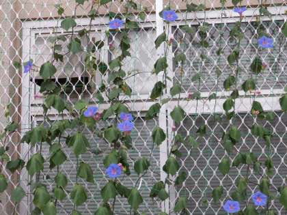 ヘブンリーブルー(あさがお)はすっかり職員室を多い,緑のカーテンの役目をしてくれています。大輪の花も20〜25咲いていてきれいです。