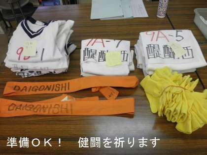醍醐西っ子の団結の印として,カラー軍手もそろえました。そして,過去の大会からずっと引き継がれている,「汗のしみ込んだタスキ」も用意されました。