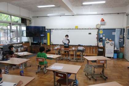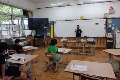 国語科の学習です。3ヒントクイズをしました。はじめは自由なお題からスタート。次は、「みんなが知っている生き物」をテーマにしました。ヒントの出し方もくふうがいっぱい!クイズに正解すると自然に大きな拍手が出て、温かい雰囲気になりました。