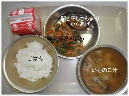 「ごはん」「いものこ汁」「開き干しさんまのからあげ」「野菜のきんぴら」