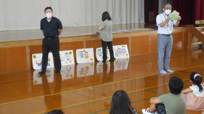 訓練の後に警察の方から「いかのおすし」や防犯ブザーの使い方、こども110番の家の話がありました。