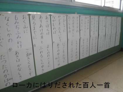 1年生の教室前のローカに,百人一首の上の句と下の句がはってあります。