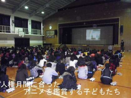 子どもたちは,体育館で人権にかかわるアニメ鑑賞をしました。
