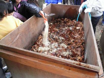 先日のクリーンキャンペーンで拾ってきた落ち葉に,米ぬか,鶏糞,水を加えて発酵を早め,堆肥化します。