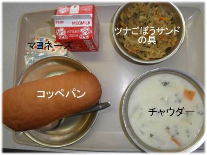 「コッペパン」「チャウダー」「ツナごぼうサンドの具」「マヨネーズ」でした。