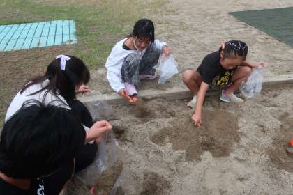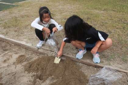 算数科「重さ」の学習。今日は、砂で1キログラムの重さづくりをしました。身近な単位ですが、いざ1キログラムをつくるとなると、何度も調整が必要な様子でした。