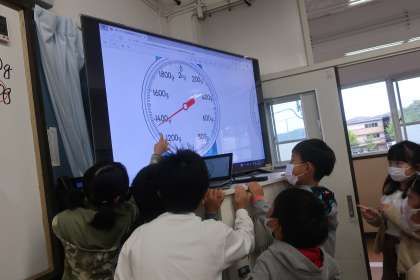 算数科「重さ」の学習です。昨日の学習の復習として、はかりの目もりのよみ方を確認しました。大型テレビに映し出したはかりの目もりを一つ一つ確かめながら、『グラム』と『キログラム』の両方の言い方についてふり返ることができました。
