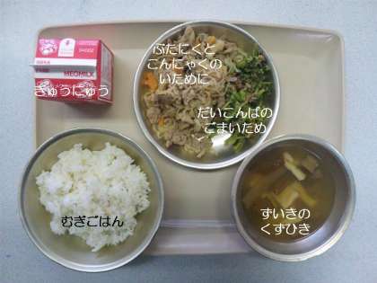 今日の献立は,『豚肉とコンニャクの炒め煮』『大根葉のゴマ炒め』『ずいきのくずひき』『麦ごはん』『牛乳』です。