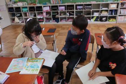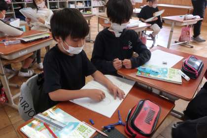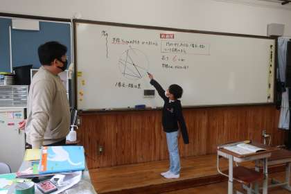 算数科の学習です。コンパスを使って上手に円を描くことができるようになってきた子どもたち。今日は、半径と直径の違いについて話し合いました。話し合いのなかで、半径の2個分が直径であることや、直径とは円周上の1点から中心を通って反対側の円周まで引いた直線であることなどに気づくことができました。