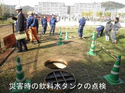 電車一両分ぐらいの大きなタンクが運動場の下に埋まっています。何と100トンの飲料水のタンクです。普段は,水道管に直結されており,水が循環しているのですが,震度5以上になると自動的に遮断され,災害時に避難されてきた地域住民の飲料水が確保できるということです。