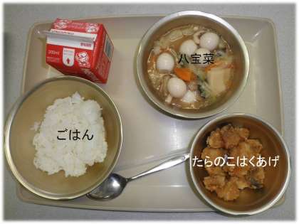 「ごはん」「八宝菜」「たらのこはくあげ」です。