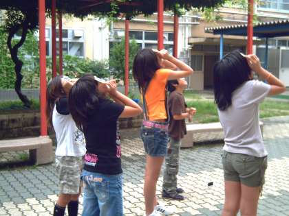 子どもたちは「たいようめがめ」をグループでまわしながら、日食の観察を楽しみました。