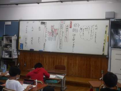 修飾語の学習をしています。「水がさらさらと流れる」「水が勢いよく流れる」みんな異なった答えを書いていました。