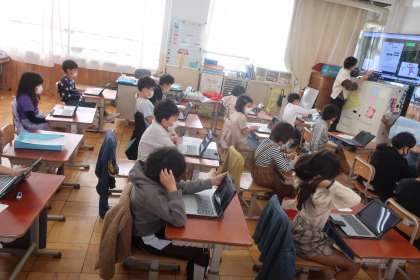 国語科の学習です。「読み・書き」の支援や挿絵の説明等々、デジタル教科書のさまざまな機能にふれました。