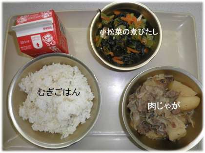 「むぎごはん」「肉じゃが」「小松菜の煮びたし」です。