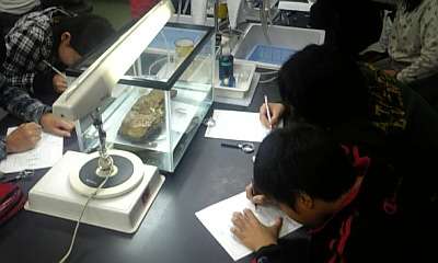 子どもたちは,はじめて見る実験・観察器具にどきどきしながら,学習を進めています。子どもたちは,石についての見方がかなり変わると思います。
