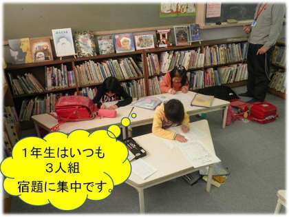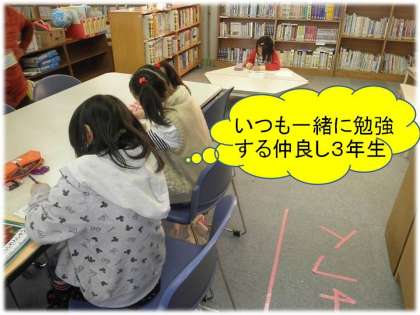 授業が早く終わった1年生が,一足早くまなび教室にやってきて,お気に入りの座卓で宿題をしていました。そして,1年生と入れ替わりに,3年生4年生が少し遅れて4時前にきました。仲良しのお友達といつも一緒に勉強をしています。