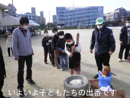 10時前から,いよいよ子どもたちの出番です。みんなで交代しながらひと臼つきました。