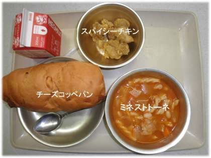 今日の「ミネストローネ」は,イタリアの料理で,「具だくさん」という意味があります。いろいろな野菜と米やパスタなどを煮込んだスープです。