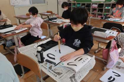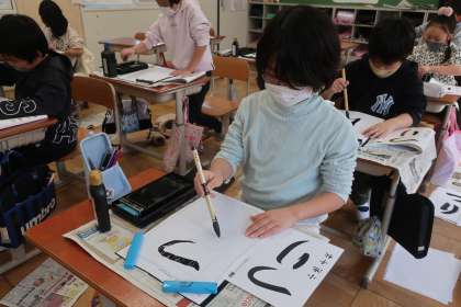 書写の学習です。今日学習した字は『つり』。ひらがなの筆遣いに気を付けてしなやかに書き上げることができました。
