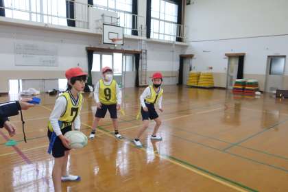 今日はグランドコンディションが思わしくなかったために体育館で活動しました。ボールをキャッチした直後の素早い動きや相手をかわすフットワークなど、練習を重ねるごとに上達しています。試合ではチームで声を掛け合いながら、元気いっぱいに活動していました。